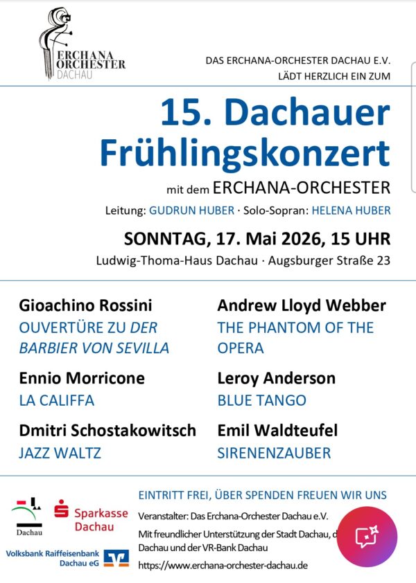 Gastbeiträge der Veranstalter in der Reihenfolge des Veranstaltungstermines nach jeweiliger Aktualisierung Erchana-Orchester Dachau am Sonntag, 17.05.2026 Altochor Altomünster – Konzertvorausschau für II. Halbjahr 2026 —Trennzeile: Erchana-Orchester – Frühlingskonzert am Sonntag, 17.05.2026, in Dachau —Trennzeile: Altochor – Terminvormerkung für die… Weiterlesen →