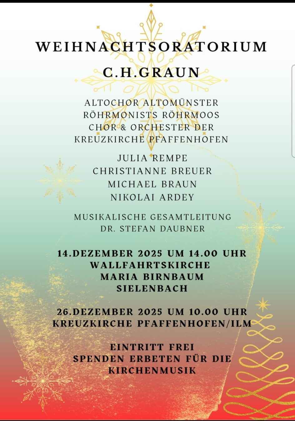Drei Chöre aus dem Aichach-Altomünsterer Land, aus Pfaffenhofen und Röhrmoos haben in den letzten Monaten intensiv und gemeinsam geprobt. Mit dem Weihnachtsoratorium von Carl H. Graun wollen sie den Musikfreunden zur Advents- und Weihnachtszeit ein besonderes Highlight bieten. Die zwei Aufführungen finden am 14. Dezember um 14 Uhr in Maria Birnbaum und am 26. Dezember um 10 Uhr in der Kreuzkirche Pfaffenhofen/Ilm statt. Der Eintritt ist frei, Spenden für die Kirchenmusik sind erbeten.
