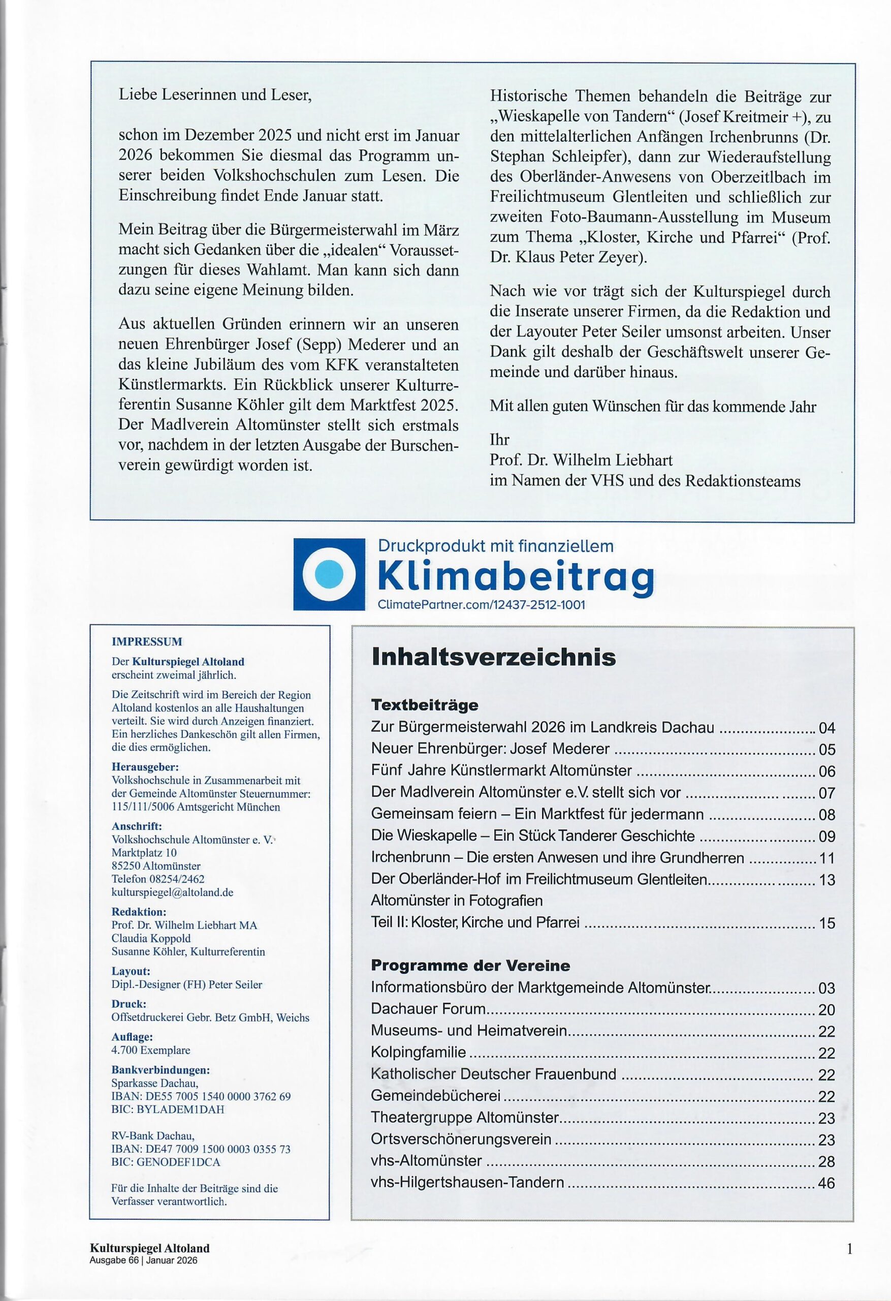 Beiträge: Prof. Dr. Wilhelm Liebhart betrachtet die Bedeutung der Bürgermeisterwahl 2026, Gisela Huber würdigt Josef Mederer als neuen Ehrenbürger für Altomünster, Andreas Holzmüller und Susanne Köhler berichten über den mittlerweile 5. Künstlermarkt in Altomünster, Kathrin Pfaffenzeller und Katrin Keller stellen den örtlichen Madlverein vor, Susanne Köhler freut sich über die Gemeinschaft beim Marktfest, ein historischer Beitrag bringt die „Wieskapelle von Tandern“ in Erinnerung, Dr. Stefan Schleipfer beschreibt die historischen Strukturen von Irchenbrunn, Dr. Melanie Bauer verfasste den Bericht über die „Translozierung“ und Fertigstellung des „Oberländer Hofes“ aus Oberzeitlbach im Freilichtmuseum Glentleiten und Prof. Dr. Klaus Peter Zeyer informiert über den II. Teil der Ausstellung historischer Fotoaufnahmen aus dem Archiv Baumann, der bis 22.02.2026 im Museum Altomünster zu besichtigen ist.