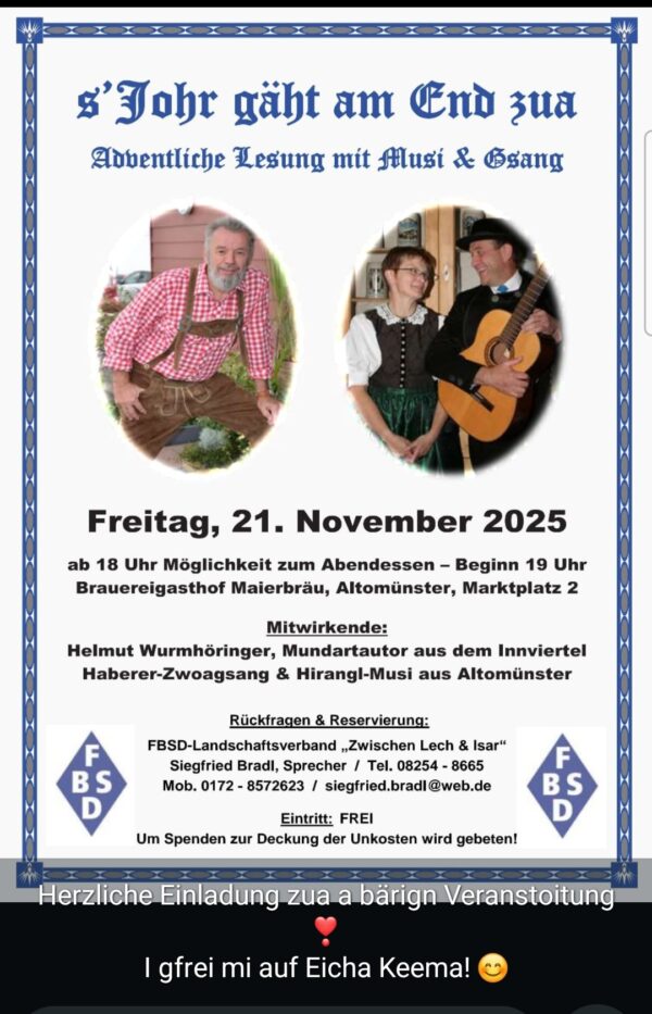 Gastbeitrag Siegfried Bradl für Förderverein Bairische Sprache und Dialekte e.V. Chorgemeinschaft Wittelsbacher Land vergrößert sich durch Pfarreiengemeinschaft Hohenwart-Tegernbach Nächstes Konzert am 30.11.2025 Gastbeitrag Vera Utz für Chorgemeinschaft Wittelsbacher Land Viele Sängerinnen und Sänger der Pfarreiengemeinschaft Hohenwart-Tegernbach mit ihren 9 angegliederten… Weiterlesen →
