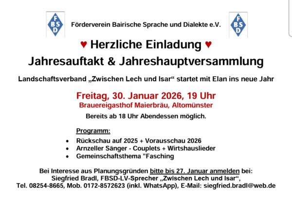 Gastbeitrag Siegfried Bradl für Förderverein Bayrische Sprache und Dialekte e.V. sowie für Verein für Theater- und Heimatpflege e.V. Zusammenfassung der Einladung für 30.01.2026: Zusammenfassung der Einladung für 3.2.2026: Gesamttext der Einladung für 30.01.2026 : FBSD_JHV 2026 Gesamttext der Einladung… Weiterlesen →