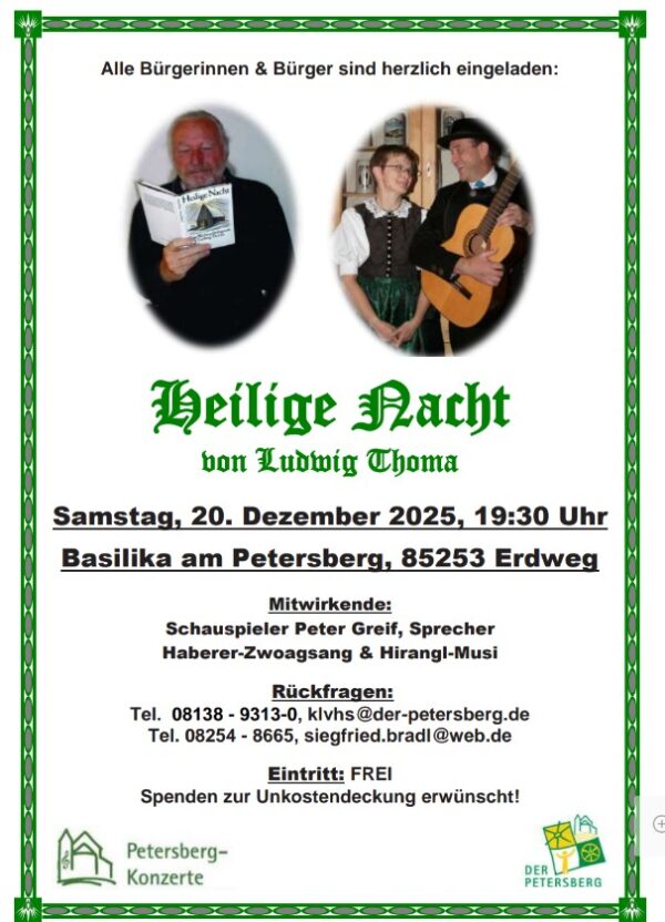 Gastbeitrag Sigi Bradl Heilige Nacht – die Weihnachtsgeschichte von Ludwig Thoma – 20.12.2025 Beginn 19:30 Uhr in der Basilika auf dem Petersberg (bei Erdweg) vorgetragen von Peter Greif, Schauspieler aus Augsburg und musikalisch umrahmt von Haberer-Zwoagsang & Hirangl-Musi mit Siegfried und… Weiterlesen →
